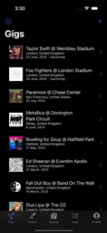 Search through our database to find the gig you attended, or if you can't find it, then no problem create your own! Visualise your gig stats with pie and bar charts, and see the different venues you have attended on a mapI created this app primarily for myself back in 2016 - I had been using a simple notepad file which had a lost of all the different bands/artists I had seen before, with the number of times I had seen them, and so wanted something a bit easier to use. It also gave me a good opportunity to learn more in depth Android design + programming skills, and also allow for me to create my own RESTful API - situated on the cloud.